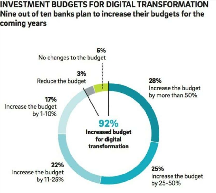 - Nine out of ten banks (approximately 92%) planned to increase their digital transformation budgets.