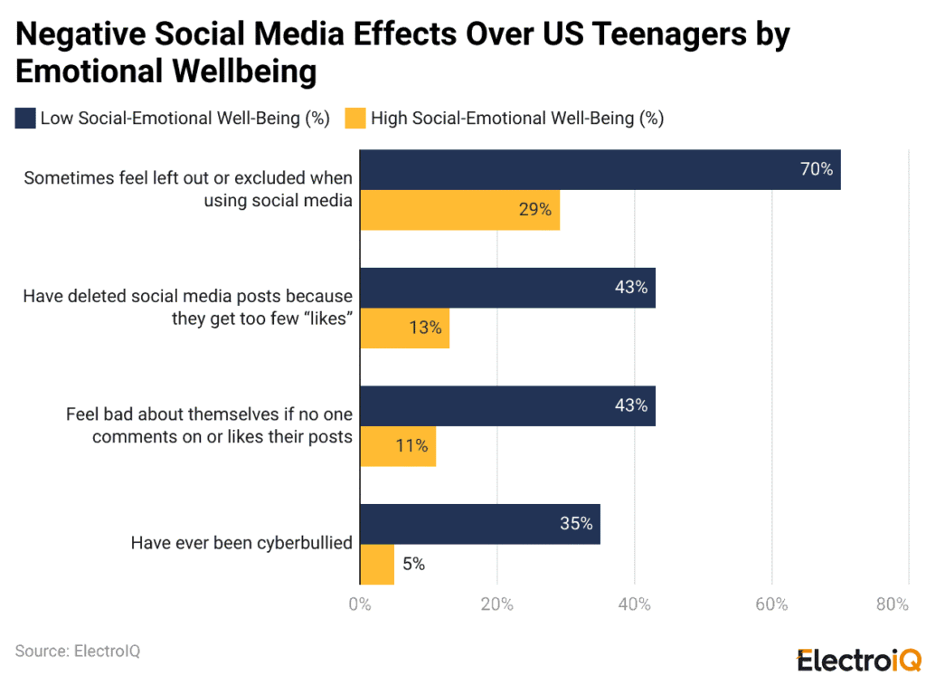 - Social media affects U.S. teens differently, as 70% with low emotional well-being feel excluded, while only 29% of teens with high well-being report similar feelings.