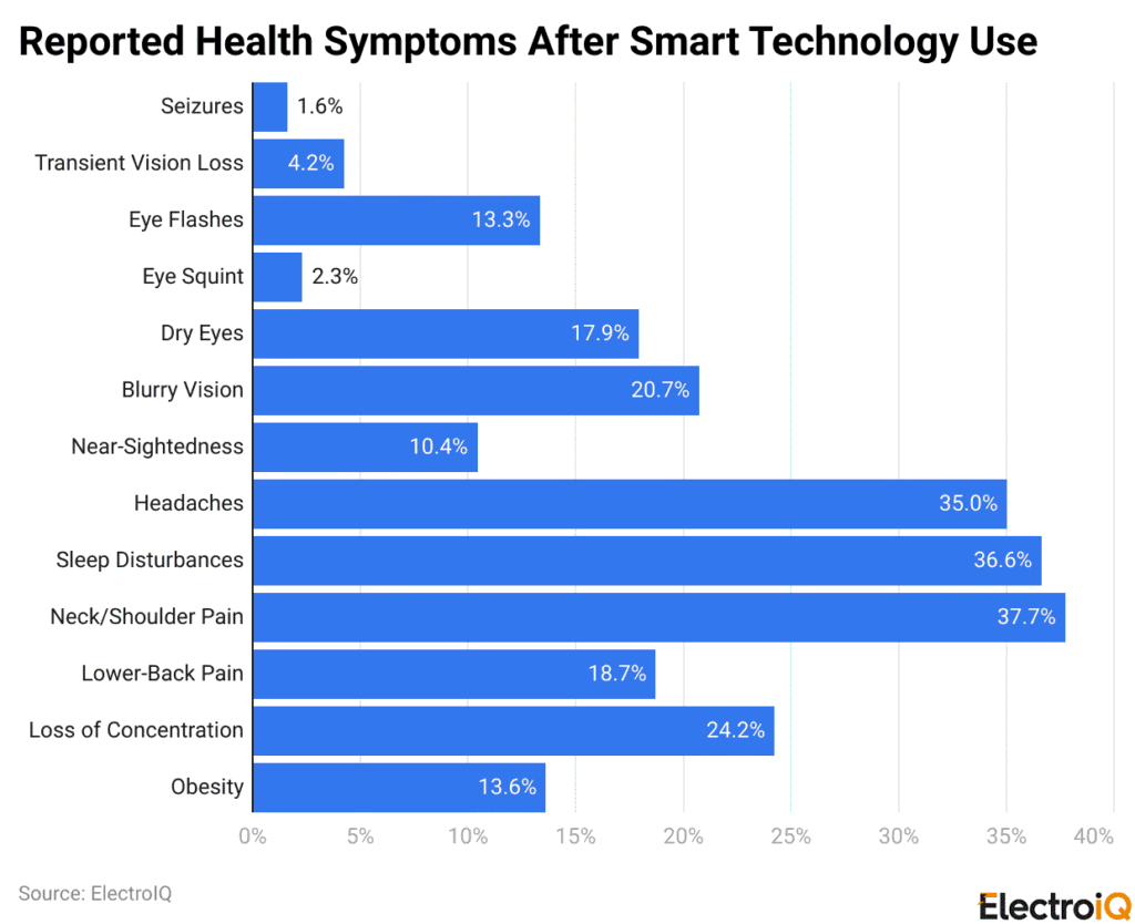 - The reported health symptoms after smart technology use show that neck/shoulder pain (37.70%) is the most prevalent issue, followed closely by sleep disturbances (36.60%) and headaches (35%).
