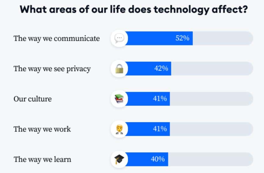 - According to a study by Tidio, the top five negative effects of technology are psychological issues (50%), sleep problems (48%), social issues (45%), difficulty forming relationships in the real world (42%) and difficulty with focus (41%).